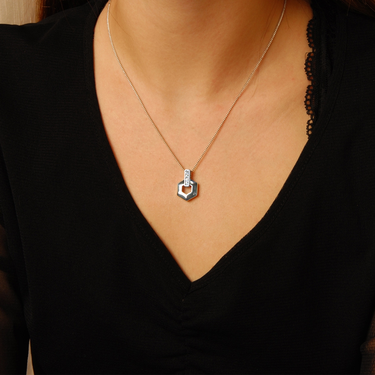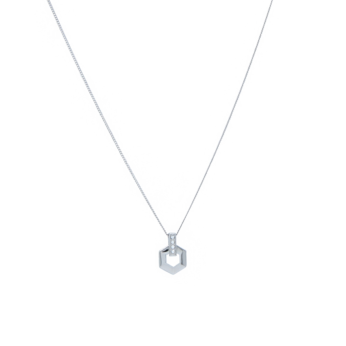 Beautifully simplistic our "Angular Glow" neckpiece is ideal for everyday wear. Showcasing a sleek metallic hexagon and a row of dazzling Swarovski crystals, this pendant on a sleek 18" designer chain is a must-have design to add to your collection. Nickel and lead free jewellery.