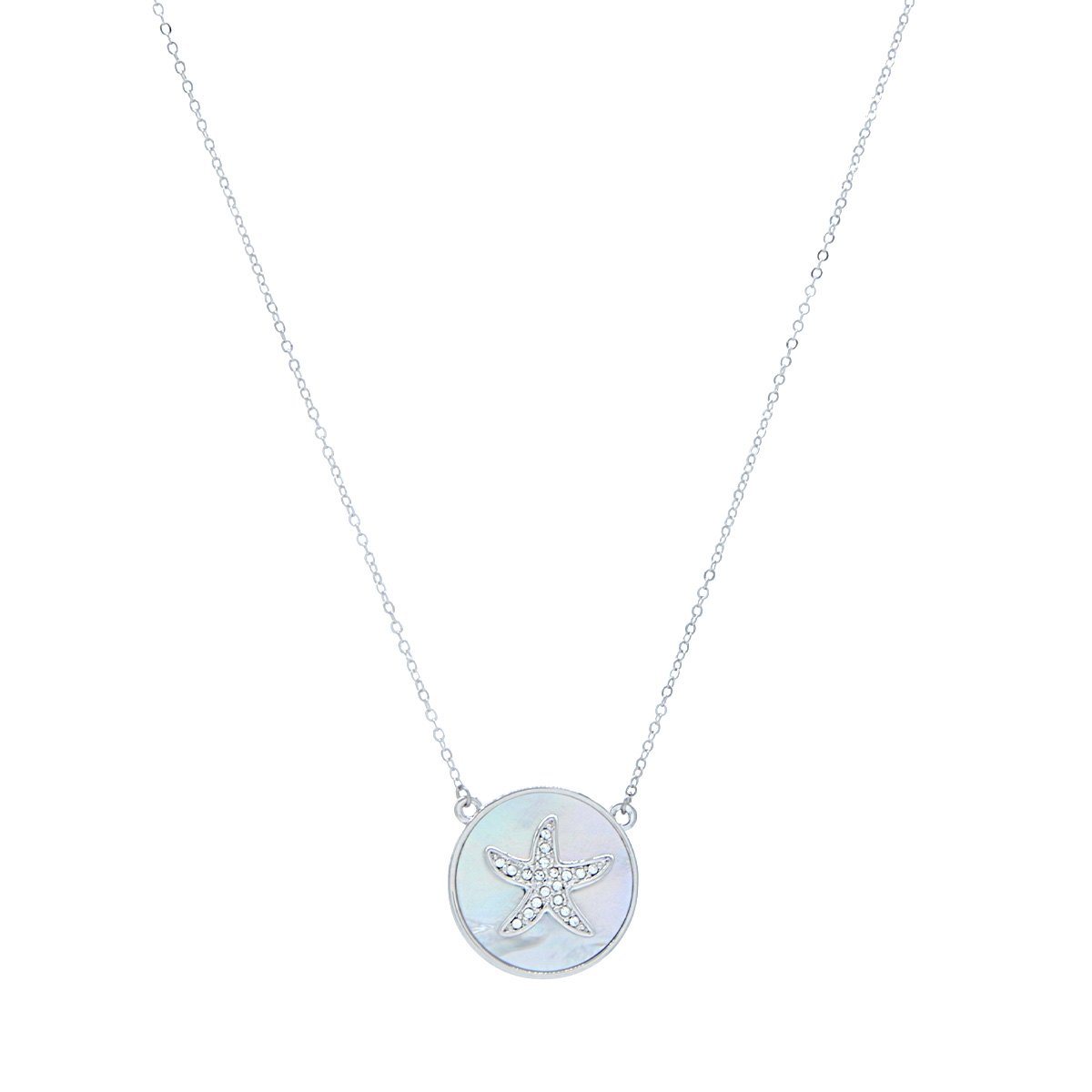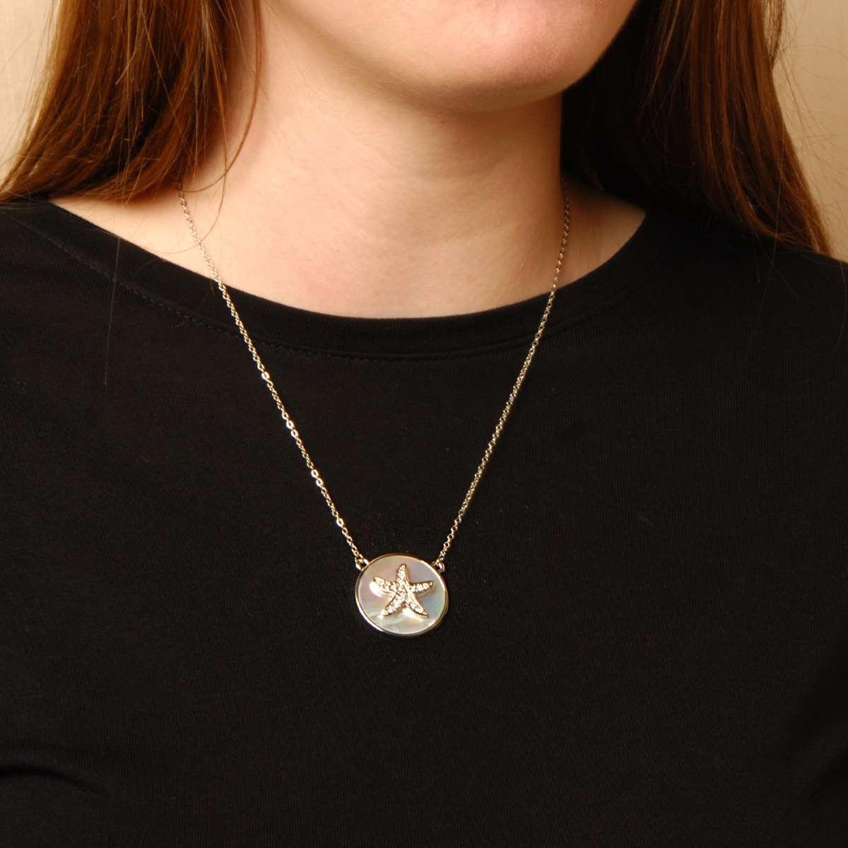 Sparkle with natural beauty when you wear our "Beach Vibes" neckpiece. Showcasing a rich mother of pearl medallion overlaid with a starfish design glowing with clear Swarovski crystal adorned from a sleek 18” designer chain to make this fun fashion accessory a must! Nickel and lead free jewellery.