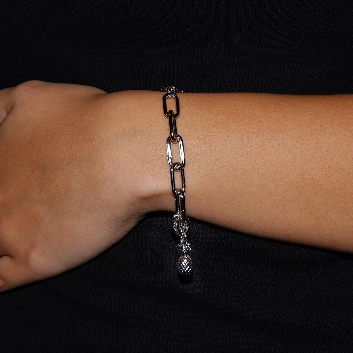 A beautiful symbol of hospitality, welcome, and friendship, our delightful "Sweet Tropics" charm is sure to sweeten any look. Boasting an intricate rhodium finished pineapple design suspended from a sparkling bail encrusted with clear Swarovski crystal, this fun charm is the perfect addition to FAC's "I Truly Care" bracelet or "Finer Things" chain. Nickel and lead free jewellery.