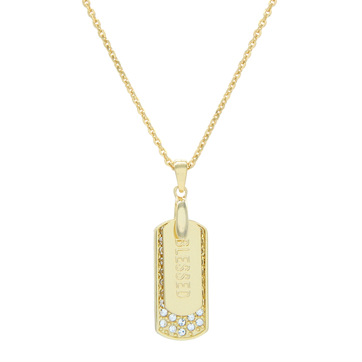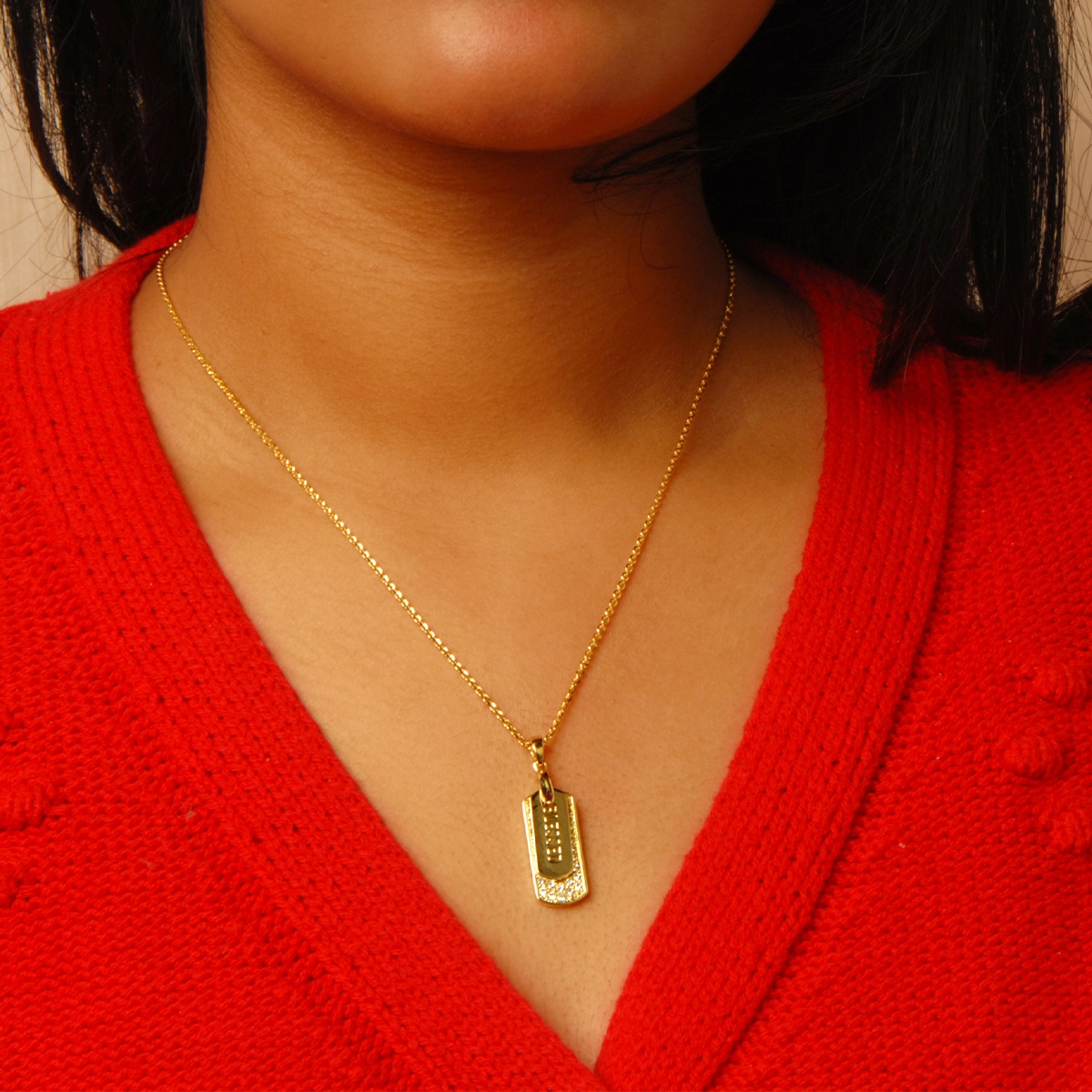 Strikingly gorgeous and empowering, our “Tags Of Inspo” neckpiece makes an inspirational fashion statement, featuring two designer tags, one studded with shimmering Swarovski crystal while the other offers a meaningful engraving, suspended from a sleek 18" chain. Nickel and lead free jewellery.
