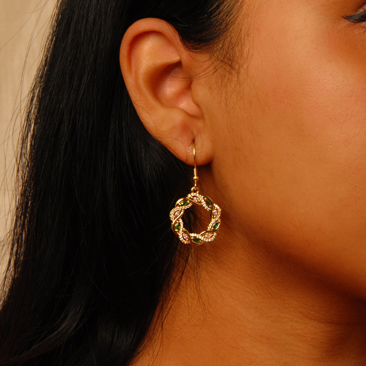 Rich and bold our "Woven Bliss" earrings showcase exquisite circles of beautifully colored rose and emerald AAA cubic zirconia in a wreath design entwined with shimmering clears, suspended from sleek sterling silver hooks. Nickel and lead free jewellery.